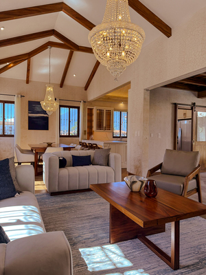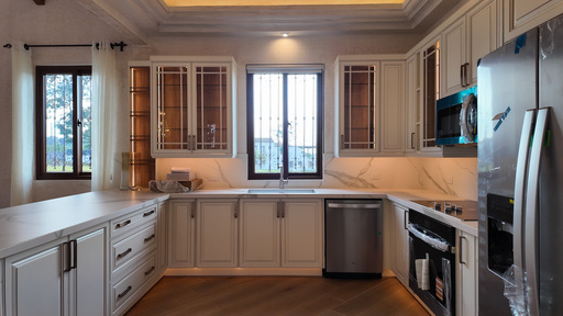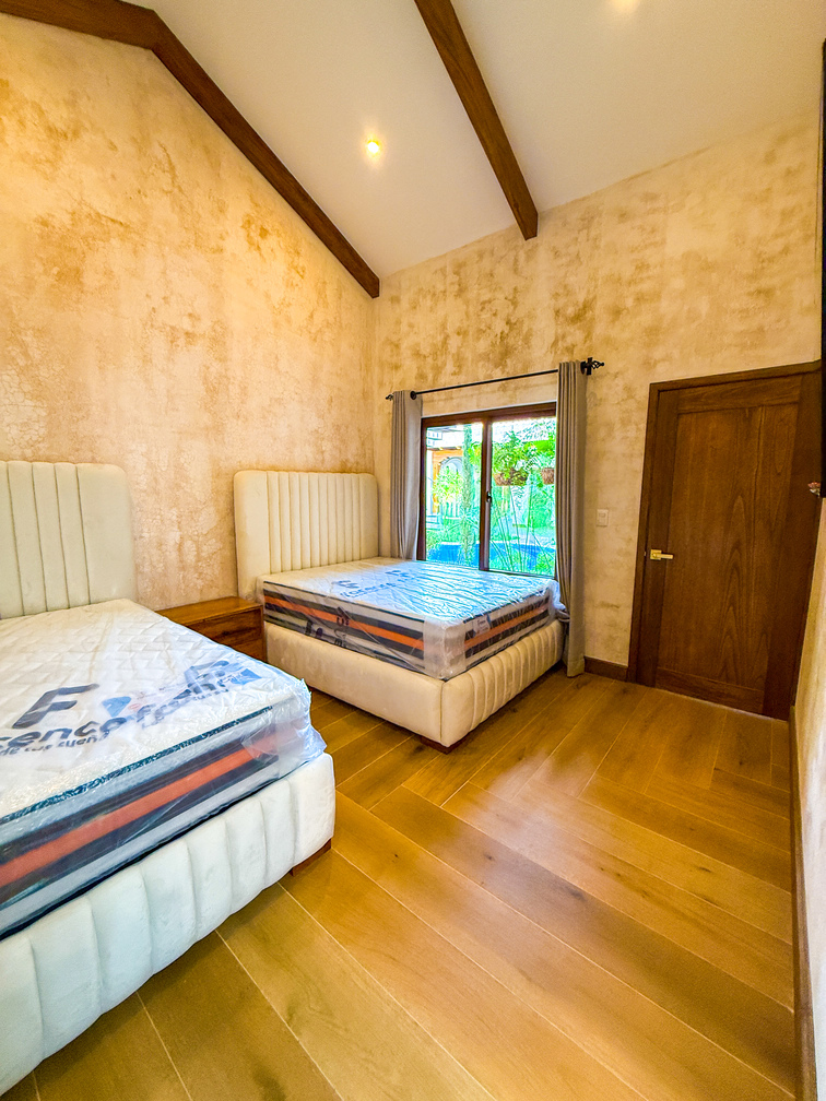 Acabados de alta calidad: carpintería en palo blanco, cocina con top de granito, pisos cerámicos, portón principal de madera con estructura metálica.