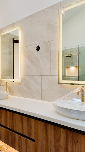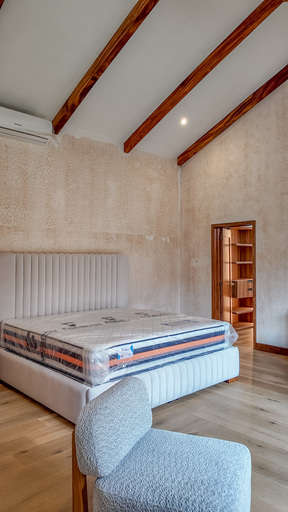 Equipamiento completo con losa sanitaria y grifería de marca, sistema eléctrico BTicino, iluminación LED, cisterna de 2,800 litros, bomba y tanque hidroneumático.