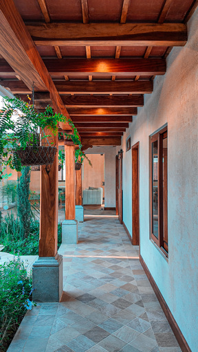 Diseño arquitectónico con detalles coloniales: terraza española, techos inclinados con artesonado en madera de ciprés y teja de barro, ventanería en PVC imitación madera.