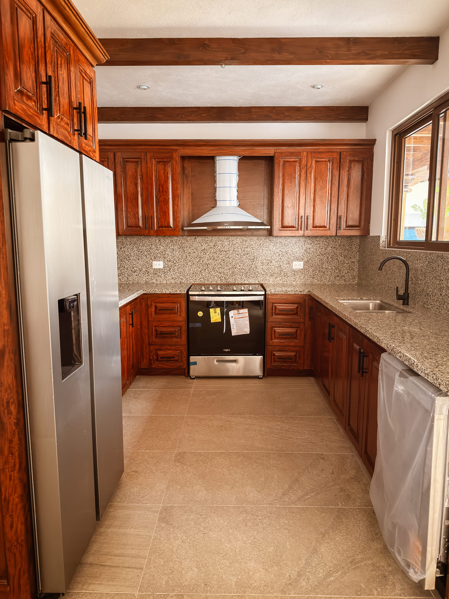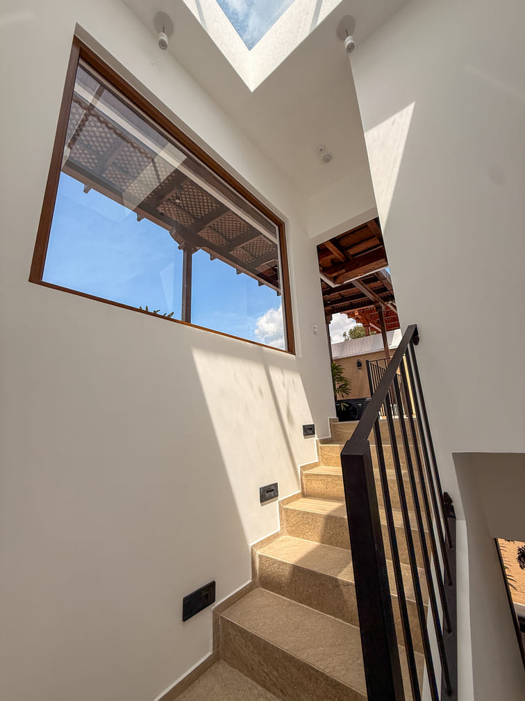 Acabados de alta calidad: carpintería en palo blanco, cocina con top de granito, pisos cerámicos, portón principal de madera con estructura metálica.
