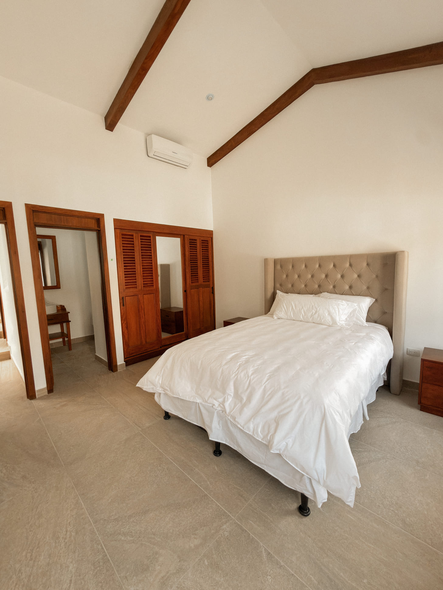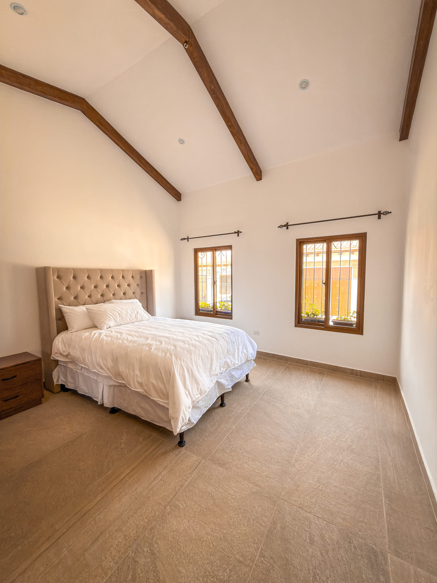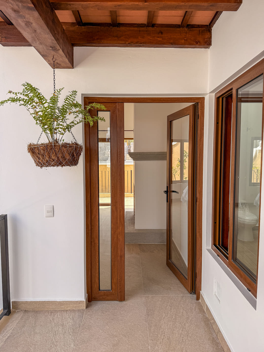 Diseño arquitectónico con detalles coloniales: terraza española, techos inclinados con artesonado en madera de ciprés y teja de barro, ventanería en PVC imitación madera.