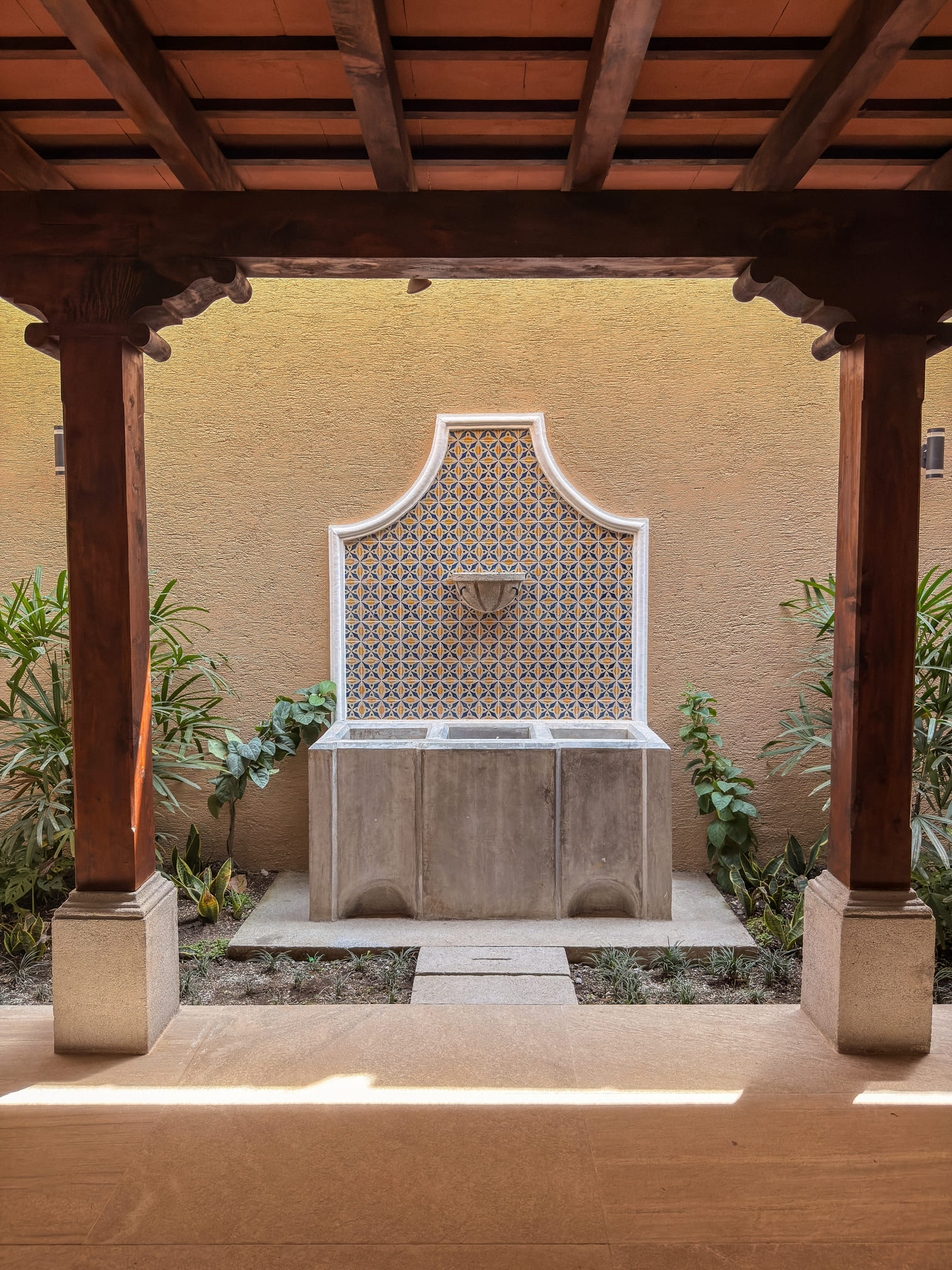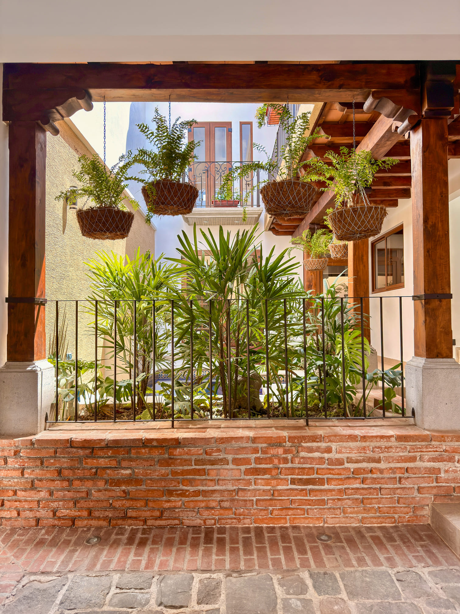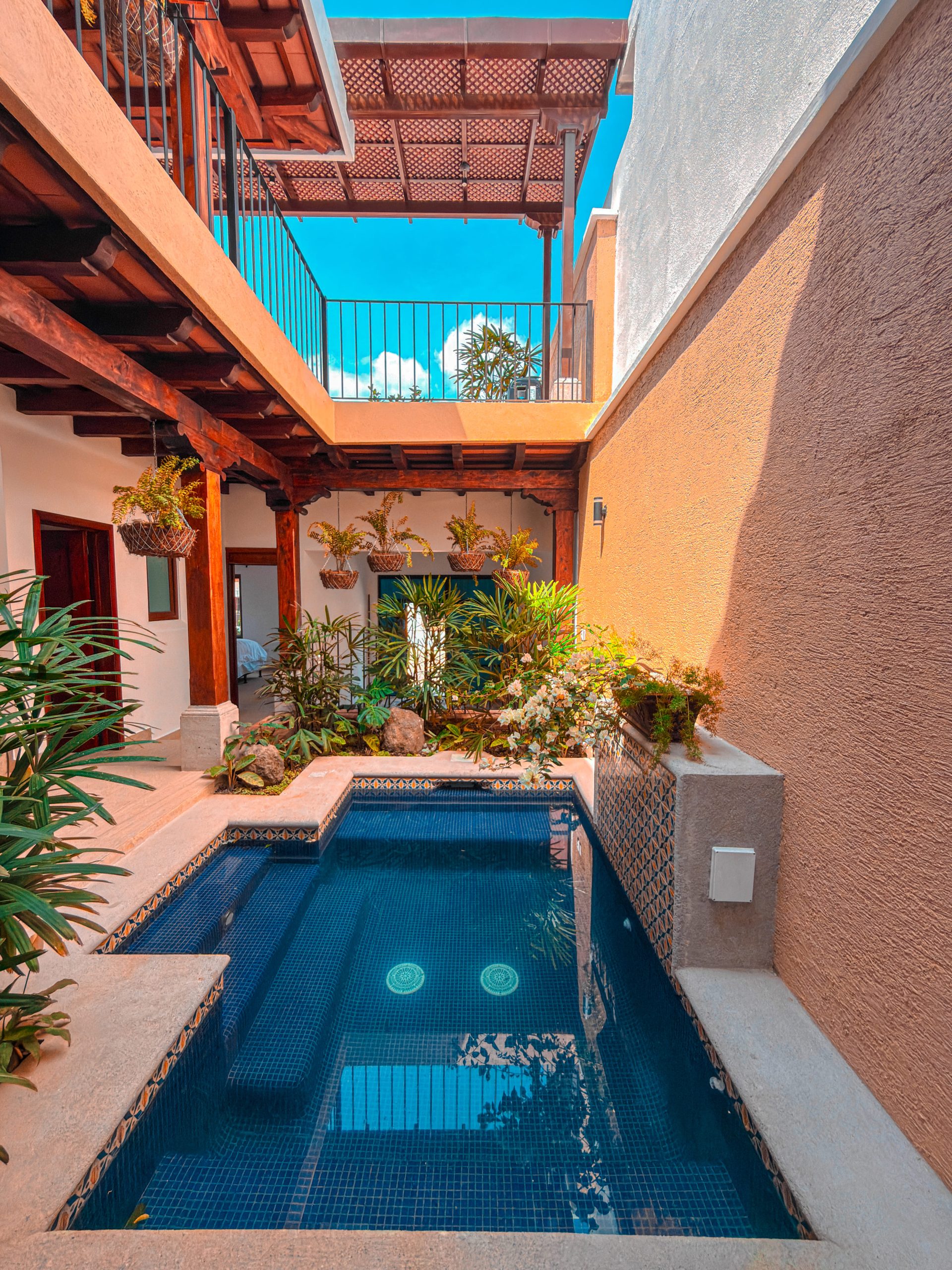 Diseño arquitectónico con detalles coloniales: terraza española, techos inclinados con artesonado en madera de ciprés y teja de barro, ventanería en PVC imitación madera.