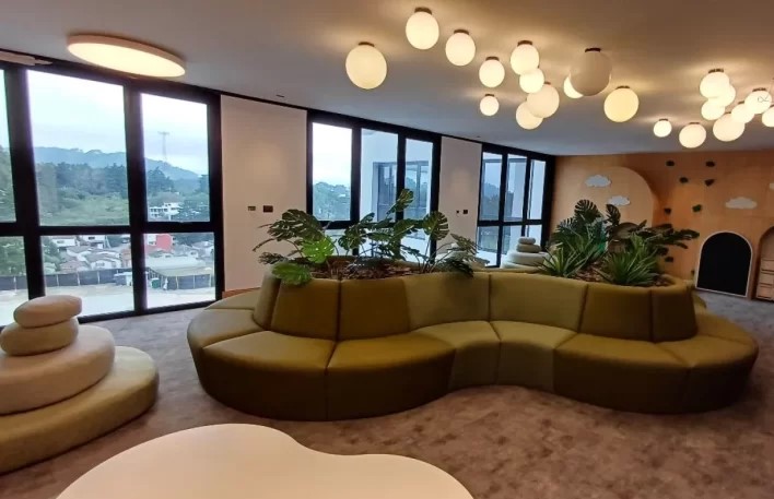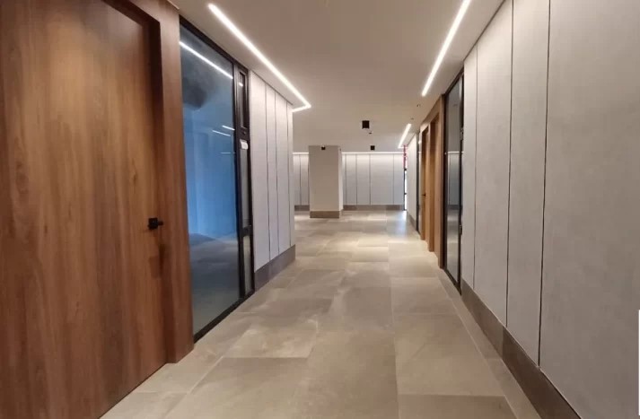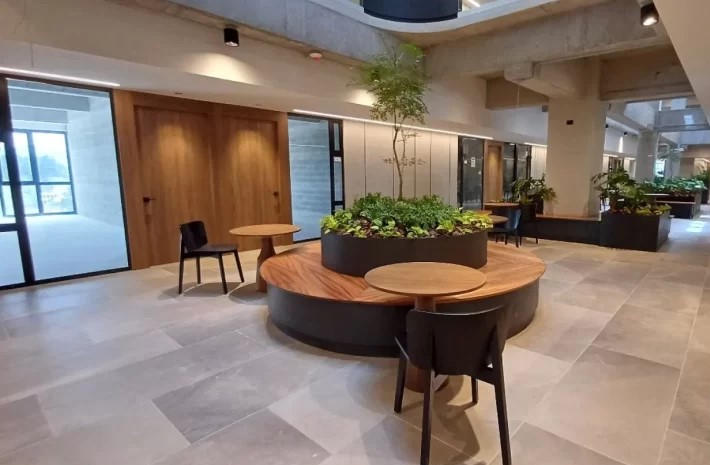 Recepción, Sala de espera, Salas de reuniones y co-working, espacio de cafetería y baños en todos los niveles comunes.